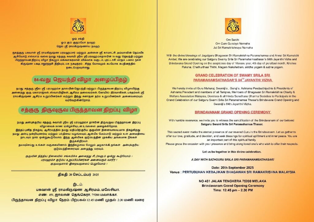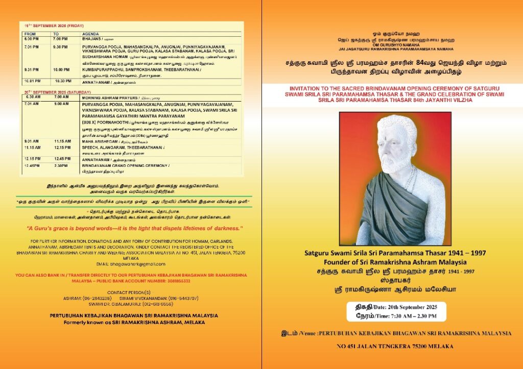 மலேசியாவில் ஆன்மிகச் சேவையையும், பக்திப் பணியையும் முன்னெடுத்து வந்த ஸ்ரீ ராமகிருஷ்ணா ஆசிரமம், மலாக்கா, இன்று “பெர்துபுகான் கெபாஜிகன் பகவான் ஸ்ரீ ராமகிருஷ்ணா மலேசியா” என்ற பெயரில் இயங்கி வருகிறது. அந்த ஆசிரமத்தின் நிறுவனர், சத்குரு ஸ்ரீலா ஸ்ரீ பரமஹம்ச தாசர் (1941–1997) அவர்களின் 84வது ஜெயந்தி விழாவும், அவரின் திருவுருவ பிருந்தாவனத் திறப்பு விழாவும் பெருவிழாவாக நடத்தப்பட உள்ளது.