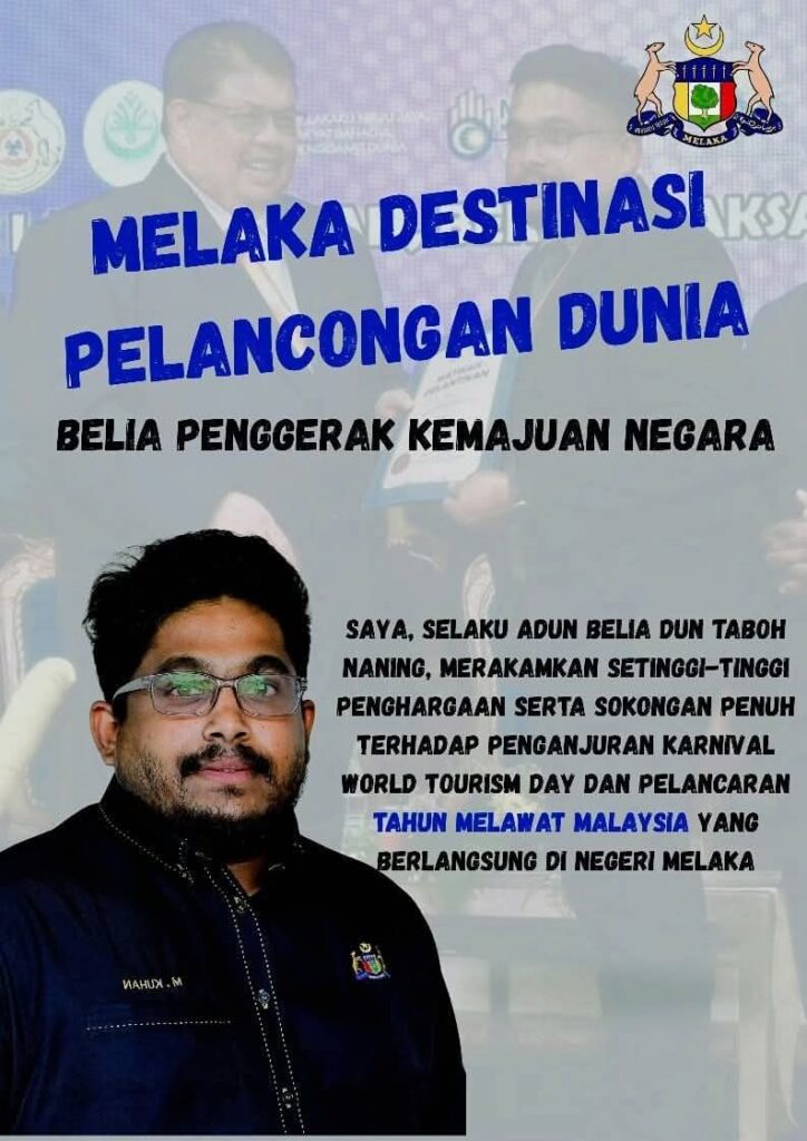 மலாக்கா மாநிலத்தில் நடைபெற்று வரும் உலக சுற்றுலா தினக் கர்னிவல் மற்றும் மலேசியாவை பார்வையிடும் ஆண்டு துவக்க விழாக்கு தபோ நானிங் தொகுதி இளைஞர் பிரதிநிதி குகன் ராம் தனது முழுமையான ஆதரவை தெரிவித்துள்ளார்.